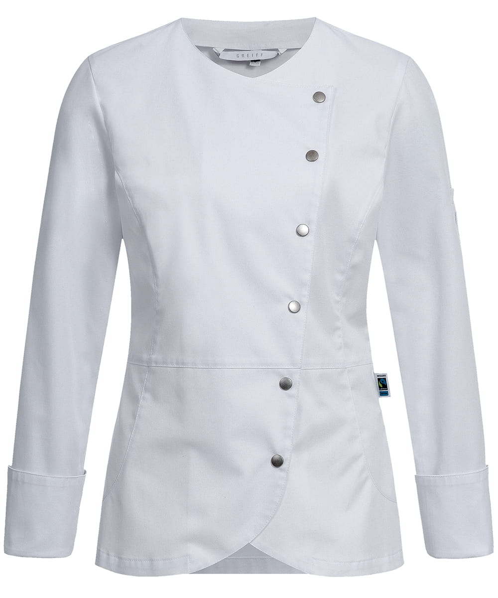 Damska, asymetryczna bluza kucharska Greiff CUISINE PREMIUM o koruj Regular Fit, w białym kolorze. Elastyczny materiał i otwory wentylacyjne to kombinacja zarówno stylu jak i wygody.