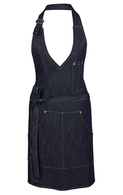 Damski fartuch bistro - niebieski denim, z regulowaną klamrą.
